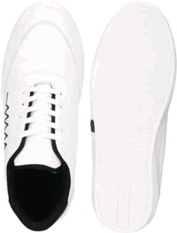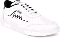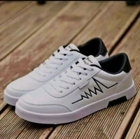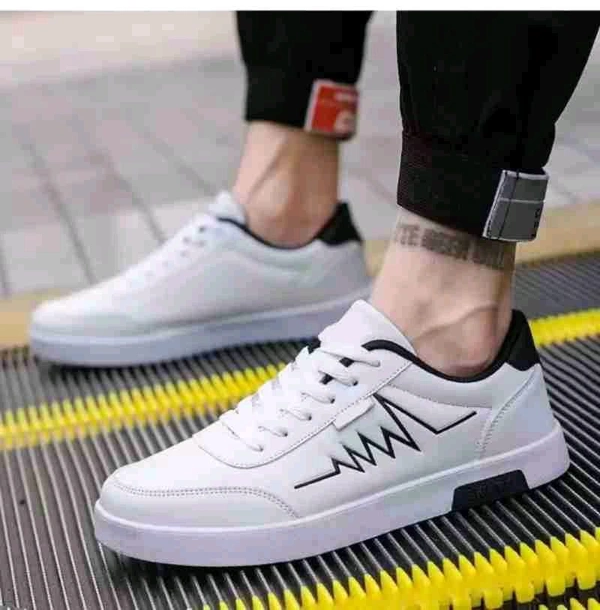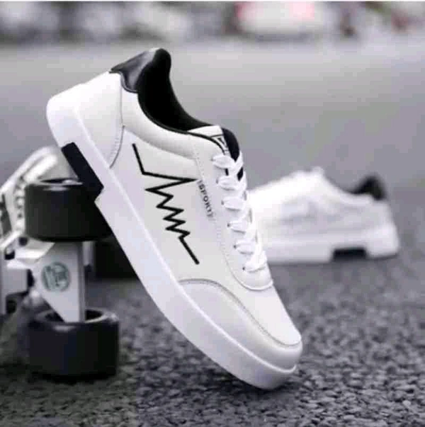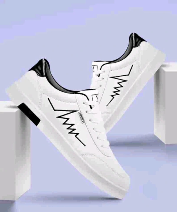 a pair of stylish white sneakers with a minimalistic design. The shoes feature a black zigzag line pattern on the side, resembling an electrocardiogram (heartbeat) line. The sneakers have a low-top design with black detailing on the heel and a clean white rubber sole. They appear to be casual footwear suitable for everyday wear, offering a modern and sleek look.