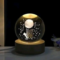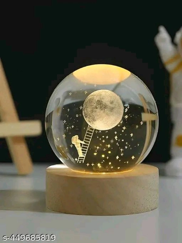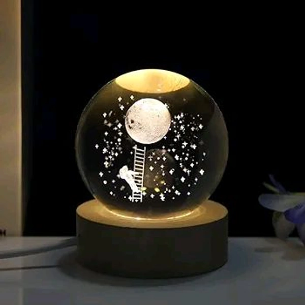 Decorative light or night lamp in the form of a glass globe placed on a wooden base. Inside the globe, there is a whimsical scene featuring a small figure climbing a ladder towards the moon, surrounded by tiny stars. The moon is illuminated, creating a soft, warm glow, while the stars add a magical effect to the design. The scene gives a dreamy, enchanting vibe, making it suitable as a decorative piece for a bedroom or a cozy space.