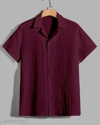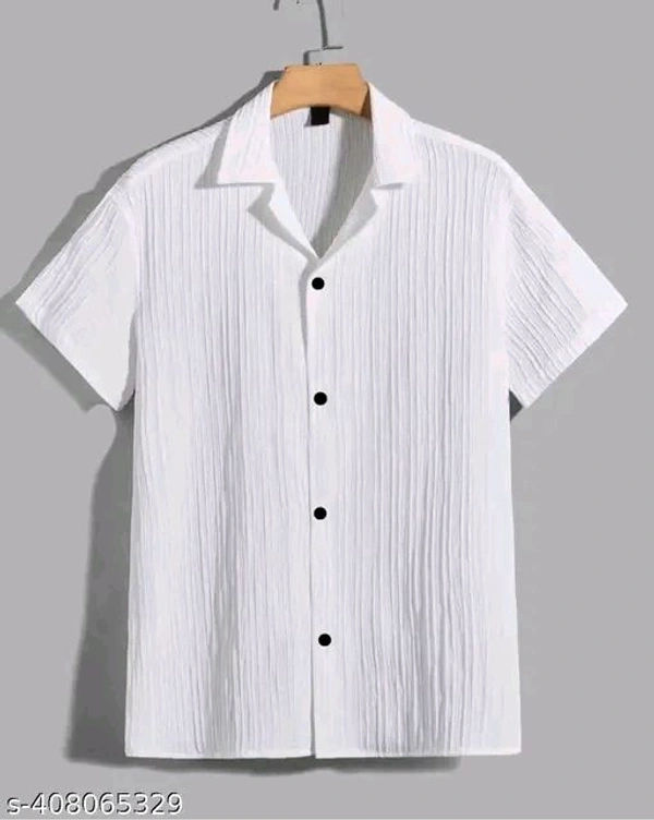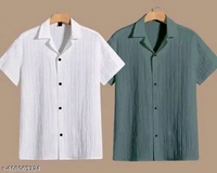 Two short-sleeve button-up shirts with a textured, crinkled fabric design. One shirt is white, while the other is a muted green color. Both feature a relaxed collar and black buttons down the front, giving them a casual yet stylish look suitable for warm weather.
