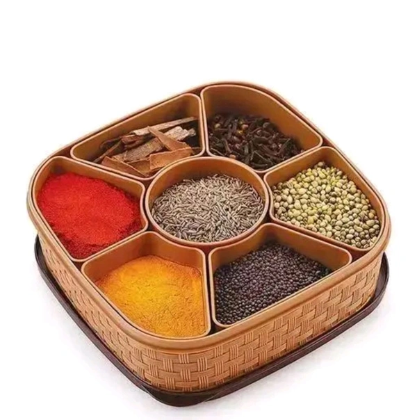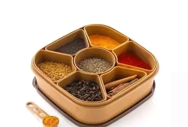 Spice Box, Plastic Square 7 Sections Multipurpose Masala Rangoli Dabba Box Set (Brown) 1 Piece Spice Set