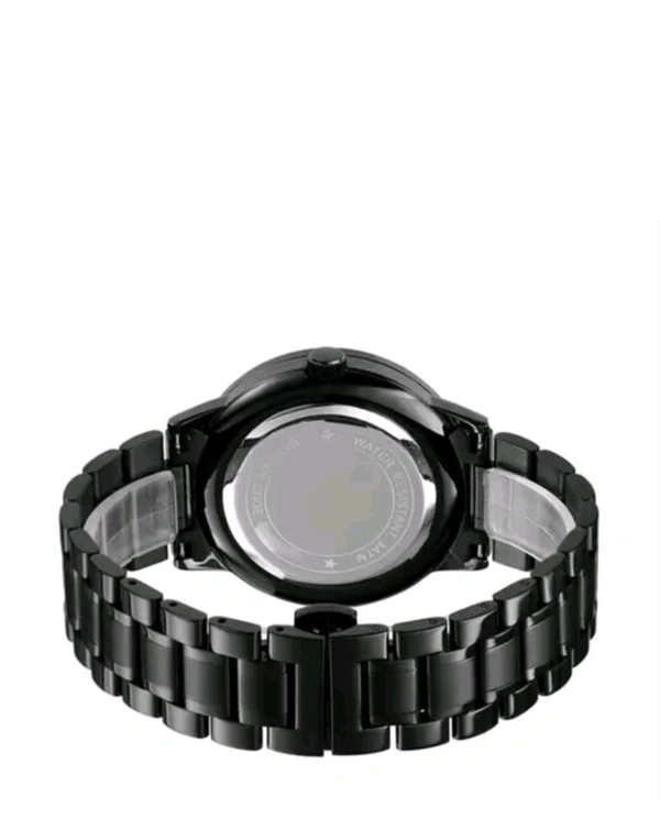 The watch comes with a black stainless steel band, offering durability and a stylish look.